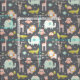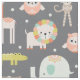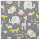 Tecido da selva de boho bonito com pequenas girafas, elefantes, jacarés, corujas e macacos em galhos.