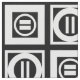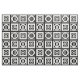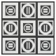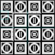 O tecido geométrico na moda apresenta quadrados brancos com espaço entre eles sobre fundo preto. Os quadrados grossos diagonalmente opostos contêm cada um um um círculo branco fino com um dentro de signo grosso igual. Por outro lado, os quadrados finos contêm cada um um um círculo branco espesso que toca as arestas do quadrado com um dentro de sinal fino vertical igual. Imagem criada digitalmente. Copyright © 2015 Claire E. Skinner. Todos os direitos reservados.