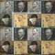 Tecido de Vincent van Gogh, remake famoso de quatro desenhos dos retratos de auto na paleta e no texto monocromáticos mornos da pia batismal do na moda com "pinturas famosas da noite estrelado" e dos "girassóis" em cores amarelas azuis do fundo