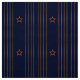 Este tecido apresenta um padrão original do estilo da Deco de Arte Patriótica consiste em 4 conjuntos de fitas verticais douradas de estilo militar duplo alternadas com uma estrela vermelha de 5 pt, revestida com ouro, todas colocadas sobre um fundo de azul marinho escuro rico. Perfeito para qualquer escritório, corredor, biblioteca, caverna-homem, etc.