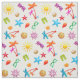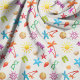 Costurando e criando tecidos com um design de padrão de verão. Cores tropicais brilhantes compõem essa divertida coleção de conchas, estrelas-do-mar, palmeiras, óculos de sol, sandálias de dedo e muito mais. Escolha qualquer cor de fundo, em algodão, linho, sarja ou deixe neutro.