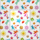 Costurando e criando tecidos com um design de padrão de verão. Cores tropicais brilhantes compõem essa divertida coleção de conchas, estrelas-do-mar, palmeiras, óculos de sol, sandálias de chinelo e muito mais. Escolha qualquer cor de fundo, em algodão, linho, sarja ou deixe neutro.