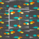 Esferas e triângulos modernos do meio século em um fundo cinzento escuro com as esferas nas cores de azul brilhante, da laranja e do amarelo.