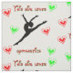 Essa garota adora ginástica! Este ginasta está dando um salto no ar cercado por fontes decorativas e corações de rabisco vermelho e verde!
