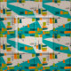 O padrão dos retângulos modernos do Médio século em laranja, ouro e lacre num fundo bege com espirais e linhas pretas. O tecido perfeito para a decoração do médio.