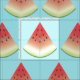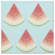 Este tecido apresenta um padrão de fatias de melancia de desenho em uma cor azul de fundo.