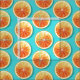 Um padrão de fatias de laranja frescas e suculentas em tons profundos de laranja tangerina e laranja vermelha, com textura aquosa que lhe dá aquele aspecto recém cortado. Eles são colocados sobre um fundo azul brilhante para um visual brilhante e de verão.