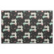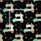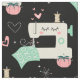 Minha ilustração vetorial original de máquinas de costura felizes, pinos, almofadas de pinos, starbursts, quadrados de colcha, corações e linhas, em bronzeado, rosa, aqua, cinza e branco em preto.