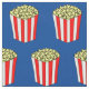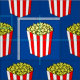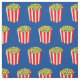 Legal filme tecido temático com caixinhas de pipoca bonitinhas com milho pipoca amarelo em um pacote listrado vermelho e branco. Bonito fundo azul para uma noite com as estrelas. Faça legal cortinas de filmes ou roupas com este padrão divertido.