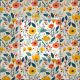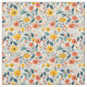 Um vibrante tecido floral pintado manualmente no verão. Um belo design de flores amarelas e cor-de-rosa com folhagem verde azul e bagas vermelhas. Dá uma sensação adorável de verão. Excelente para projetos de decoração, de construção, de costura e de colagem.