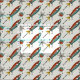 A minha ilustração vetorial original dos foguetes atômicos retrorreflectores, Saturno, estrelas e átomos; em aqua, vermelho alaranjado, ouro e preto sobre fundo texturizado; em branco, tons de cinza e bronzeado.