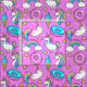 Um unicórnio engraçado e desenho animado de gatinho da Kitschy cor-de-rosa ilustrado com um fundo rosa brilhante com arco-íris, sorvetes e rosquinhas