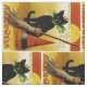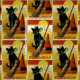 Vintage Halloween ilustra um cartão de saudação mostrando um gato preto, vassoura-de-bruxa e chapéu com o texto "Feiticeira Amigável ou Fay, preencha o desejo que deseja hoje."