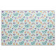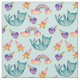 Esta é uma ilustração de um gato verde que flutua no céu com arcos-íris, nuvens, estrelas de tiro e corações. Foi pintada com aguarela e feita em um teste padrão.