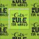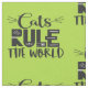 Um trendy e adorável padrão com as palavras "Gatos governam o mundo" em caracteres pretos, decorados com bigodes brancos, arranhões de gatos, um ratinho minúsculo, e uma pata, sobre um fundo verde brilhante.