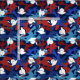 Tecido de graduação em camuflagem em campos de vermelho e azul e padrão de bonés de formatura brancos.