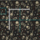 Crânio de estilo Grunge, ossos cruzados e vários instrumentos musicais em fundo preto, padrão de repetição sem descontinuidades