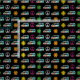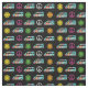 Tecido hippie bonito com divertido padrão de barramento retrorreflector de sinais de paz e flores bonito em cores hippies neonatais legal.