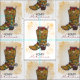 Esta bota de vaqueiro está toda vestida para o feriado com uma corda de luzes embrulhada em volta dela e o impulso foi substituído por uma campainha. É uma forma festiva e ocidental de celebrar o feriado. O plano de fundo apresenta cintilações e flocos de neve com as palavras Holidays Howdy no fundo. A bota está cheia de um presente e uma bengala doce. Produtos correspondentes disponíveis.