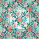 Este primavera jardim, flores e pintura de cor de água foliar, padrão botânico elegante, rosas, flores de primavera silvestres, folhagem de bambu verde japonês e ramo de fruta com folhas de flores brancas, padrão florescente da natureza, cor pincelada, rosa, coral, amarelo e verde, sobre um fundo verde-aqua e verde-carnaval, arte moderna e moderna, excelente para o visto doméstico ou. Uma na moda, moda, design romântica, simples imagem trabalho de arte.