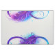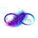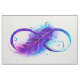 Símbolo infinito com uma bela pena pintada em cores roxas e azuis brilhantes sobre fundo branco.