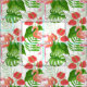 Design de padrão aquoso com flores e aves flamingos, monstera e palmeiras.