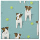 Esta divertida tecido temática Parson / Jack Russell Terriers apresenta 13 JRTs/PRTs ilustradas com várias marcas de cabeça e corpo marrom e preto mais 13 bolas de tênis espalhadas aleatoriamente organizadas em um padrão de gota sobre um fundo especial personalizável - cada um dos cães está com uma inclinação adorável da cabeça, disposto a jogar uma das bolas - Jack Russell Terriers com tênis bolas © katz_d_zynes 2020