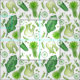 Um bonito tecido verde de cozinha, decorado com canetas e desenhos tinteiros de vários vegetais, incluindo couve, funcho, aipo, ervilhas e mais pintados em vários tons de aquarela verde.