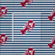 Uma lagosta vermelha com seu monograma ou texto ajustou-se em um fundo listrado do azul marinho e o branco. Um design perfeito para uma praia ou uma casa de verão pelo oceano, assar da lagosta na costa, reunions ou apenas vida diária. Clique sobre o logotipo de Colorfulgalshop abaixo para mais design náutico do divertimento