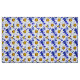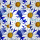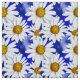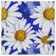 Tecido em um padrão de aquarela de margaridas brancas com centros ouro amarelos, sobre fundo em tons de denim azul