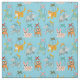 Este tecido fofo apresenta um padrão de marionetas animais fofinhos contra um fundo azul claro. Há uma marionete de gatos, uma marionete de cães, uma marionete de cabras, uma marionete de pássaros, uma marionete de coelhos e uma marionete de elefantes.