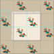 Uma vintage chamada abstrato art design, inspirada pelo movimento da era atômica dos anos 1950, tem linhas em negrito e quadrados e retângulos coloridos em turquesa, laranja, amarelo e marrom contra um fundo bronzeado.