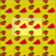 Fatias de melancia, morangos e pêssegos em design de fundo amarelo.