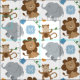 Design de tecido com padrão personalizado apresenta um monograma inicial e padrão de amigos animais da selva de bebês - um pássaro, macaco, elefante e leão. Este moderno e doce safari temático tem um esquema de cores de cores azul-bebê, azul, laranja, verde, castanho e cinza.