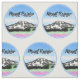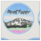 Uma ilustração de arte em linhas brancas e pretas do Monte Rainier, e do vale de Jackson Hole. O lago e o céu pintados em aquarelas azuis criam uma dramática paisagem de montanha.