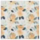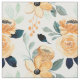 Bonito mostarda, flores amarelas aquáticas e folhas verdes e verdes e escuras em tecido branco.