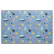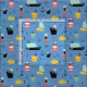Um padrão maravilhoso com veleiros e naves de cartoon amarelo e preto, submarinos bonitos, marinheiros com barba preta, calças vermelhas e um tubo, um farol vermelho e branco, e uma âncora preta sobre um fundo azul claro decorado com pequenas bolhas e ondas.