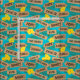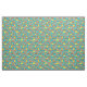 Tecido azul brilhante colorido e divertido, impresso com um padrão de nomes de praia havaianos em postes de sinalização. Mais flores amarelas de Hibiscus e folhas tropicais de palma.