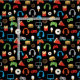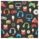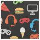 O partido do jogo de vídeo caçoa o tecido do teste padrão dos petiscos do Gamer. Teste padrão dos controladores, dos fones de ouvido, da pizza, das rosquinhas, dos hamburgueres, do gelado e das fritadas do jogo de vídeo no fundo preto. Teste padrão do partido do jogo de vídeo do gamer do divertimento para miúdos. www.SamAnnDesigns.com