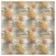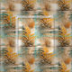 Um design artístico sem costura de ondas ouros cintilantes em azul, turquesa e espuma branca que se choca contra a costa, pintada em óleos, é emparelhado com uma bela aquarela de plantas aquáticas de inspiração japonesa em laranja e marrom, refletindo na água.