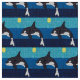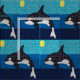 Artistic depiction of an orca whale in the ocean, illuminated by a vibrant sun in the background.