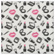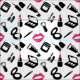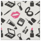 Tecido com padrão de maquiagem em rosa, preto e branco com produtos cosméticos como batom, rímel, sombra ocular e muito mais.
