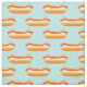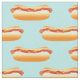 Este tecido apresenta um padrão de uma ilustração deliciosa de hot dog de desenho animado. O cachorro-quente tem um pão gostoso e há ketchup e mostarda em cima da salsicha.