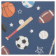 Este padrão de equipamento esportivo para crianças divertidas tem bolas de futebol, bolas de futebol, bolas de baseball, volichões, bastões de hóquei e pucks, e morcegos de beisebol. O equipamento atlético tem um fundo de azul escuro. Faz um excelente adicional ao quarto ou berçário de um menino ou menina. Também faz um belo aniversário, Natal ou outro presente de artesanato caseiro de férias.