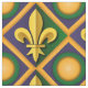 Tecido com um padrão uniforme com flur-de-lis (flores de lírio) nas cores de New Orleans Mardi Gras; roxo, ouro e design verde