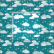 Um padrão fofo de pequenas estrelas amarelas caindo de cinzas leves e nuvens azuis fluffy. As estrelas amarelas estão ligadas a uma linha pontilhada amarela, e parecem quase como se estivessem penduradas nas nuvens. Esta cena noturna do céu é um padrão adorável para crianças.
