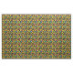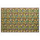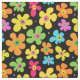 Tecido floral brilhante e ousado, com padrão de flores coloridas e divertidas a preto