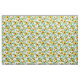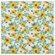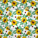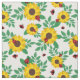 tecido floral de verão com um padrão de joaninhas sentadas e voando para grandes girassóis com folhas verdes sobre fundo branco.