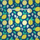 Um padrão de verão trendente de limões amarelos brilhantes de cheio e fatias de limão cercadas em folhas coloridas de chás e menta, e colocadas sobre um adorável fundo azul marinho. Este padrão de fruta dos citros é perfeito para dias cheios de sol no verão.