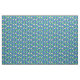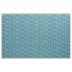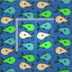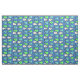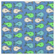 Tecido de peixes tropicais coloridos num padrão repetido num fundo azul escuro.